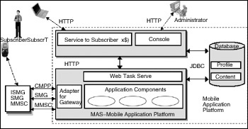 ·移動(dòng)應(yīng)用系統(tǒng)(MAS)。幾乎所有的移動(dòng)應(yīng)用都由MAS完成。MAS最主要的接口是與不同移動(dòng)運(yùn)營(yíng)商網(wǎng)關(guān)的連接,被定義為網(wǎng)關(guān)適配器(Adapter for Gateway)。