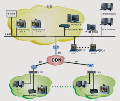 以構(gòu)建一個(gè)二級視頻網(wǎng)絡(luò)為例,整個(gè)視頻會議系統(tǒng)采用星型拓?fù)溥B接,采用兩級組網(wǎng),兩級間通過DDN網(wǎng)絡(luò)相互連通,中心點(diǎn)為一級網(wǎng),分部為第二級網(wǎng)。中心點(diǎn)由一套Penteview6100系列 MCU和幾套Penteview2030終端組網(wǎng),在其他異地的分部各放置一套Penteview 2030,各異地分部通過DDN專線劃出768K~2M的帶寬進(jìn)行視頻會議,從而組建起一個(gè)在1.5M左右的帶寬下獲得高清晰圖像的多點(diǎn)會議電視系統(tǒng)。
