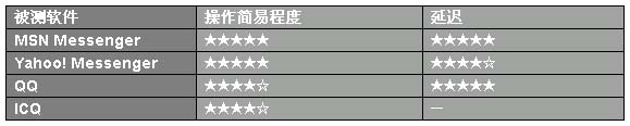MSN Messenger和Yahoo! Messenger的操作都很簡(jiǎn)單,只是MSN Messenger在同樣的畫質(zhì)下延遲要小于Yahoo! Messenger,表現(xiàn)出更優(yōu)的實(shí)用性。QQ操作也不算太復(fù)雜,只是會(huì)員和非會(huì)員在功能上有一些限制,不過在同畫質(zhì)的延遲方面做的算是出色,ICQ操作沒有測(cè)試成功。