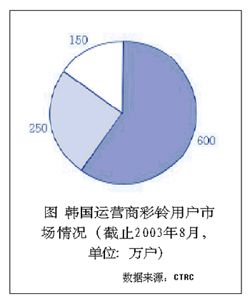 彩鈴業(yè)務最先是由韓國的SK電信于2002年3月推出的,業(yè)務一經面世就吸引了移動用戶、特別是年青用戶群體的眼球,開通的用戶數(shù)和業(yè)務使用率呈指數(shù)式增長;同時由彩鈴業(yè)務帶來的互聯(lián)網、WAP和IVR的話務量的增長進一步提升了彩鈴業(yè)務的含金量。隨后韓國的其他兩個移動運營商LG電信和韓國電信也分別于2002年6月和9月相繼開通彩鈴業(yè)務。經過運營商和彩鈴的內容提供商的前期市場推廣和運作,目前已發(fā)展了近1000萬用戶,其中運營商的市場份額如圖所示。