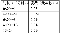 例3,國內(nèi)長途話費(fèi)在時長不超過4分鐘的情況下,按0.07元/6秒收取;超過4分鐘但不超過6分鐘,統(tǒng)一按0.06元/6秒收;超過6分鐘但不超過8分鐘,統(tǒng)一按0.05元/6秒收取;超過8分鐘但不超過10分鐘,統(tǒng)一按0.04元/6秒收;超過10分鐘,統(tǒng)一按0.03元/6秒收取。