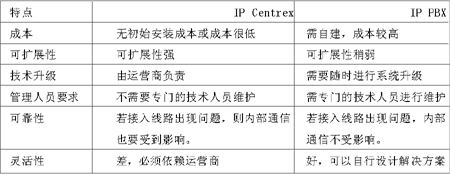 運(yùn)營(yíng)商自然不會(huì)聽(tīng)之任之,因此推出了IP Centrex業(yè)務(wù)與其相抗衡。由附表可以很明顯地看出,與IP PBX相比,IP Centrex的優(yōu)勢(shì)有:初期投入成本小、以辦公費(fèi)用方式容易控制現(xiàn)金流;無(wú)須對(duì)網(wǎng)絡(luò)、業(yè)務(wù)平臺(tái)進(jìn)行維護(hù);平臺(tái)規(guī)模與公司規(guī)模同步增長(zhǎng);具有對(duì)公網(wǎng)的開(kāi)放性;辦公地點(diǎn)的任意性、易擴(kuò)展;使企業(yè)集中在主營(yíng)業(yè)務(wù)領(lǐng)域;業(yè)務(wù)可擴(kuò)展性好。