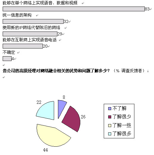從更為廣泛的層面上看,我們的調(diào)查結(jié)果顯示:三分之一的管理人員對(duì)融合網(wǎng)絡(luò)的益處一無(wú)所知或者知之甚少。困惑的并不僅是高級(jí)經(jīng)理們:分析公司IDC近期對(duì)歐洲600余名廣域網(wǎng)管理人員進(jìn)行的調(diào)查顯示,只有五分之一的人能夠完全了解融合網(wǎng)絡(luò)所實(shí)現(xiàn)的各項(xiàng)功能。