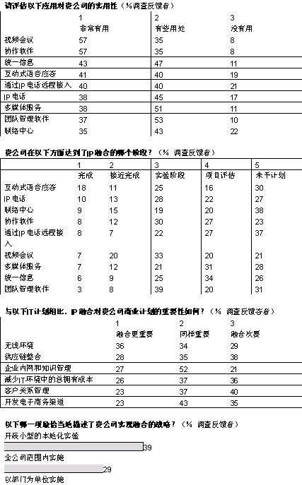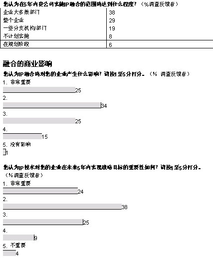 融合網(wǎng)絡(luò)已經(jīng)成為現(xiàn)實(shí)。在經(jīng)濟(jì)學(xué)家信息部展開的全球調(diào)查中,103位高級(jí)經(jīng)理中超過(guò)半數(shù)的人投票表示,他們的企業(yè)已經(jīng)開始實(shí)施IP網(wǎng)絡(luò)融合,還有26%表示他們將計(jì)劃部署。