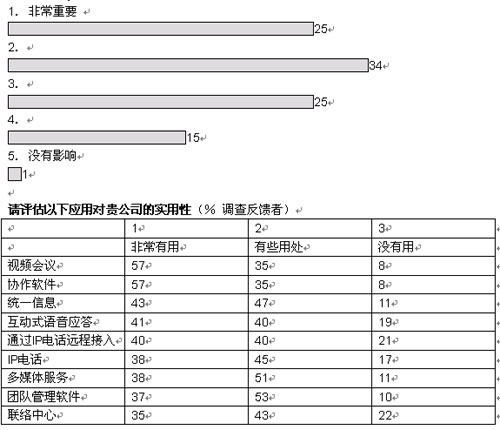 我們調(diào)查的企業(yè)中,有超過(guò)三分之二將在未來(lái)五年內(nèi)實(shí)現(xiàn)大多數(shù)或者所有部門向融合網(wǎng)絡(luò)的轉(zhuǎn)型。大部分企業(yè)采取按部就班的形式在某些特殊部門和業(yè)務(wù)開始部署。在融合應(yīng)用中,IP語(yǔ)音電話將在未來(lái)三年內(nèi)吸引大量投資;管理人士期望通過(guò)大幅削減公司內(nèi)部的通話費(fèi)用獲得早期的回報(bào)。在更廣泛的層面上,大多數(shù)管理者預(yù)計(jì),融合網(wǎng)絡(luò)對(duì)其企業(yè)的商業(yè)影響將會(huì)“非常重要”或者“重要”。
