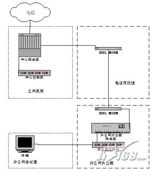 。。對于一些距離電信機(jī)房(網(wǎng)絡(luò)中心)不是很遠(yuǎn),在一公里以內(nèi)的用戶,可以采用雙絞線解決方案。實(shí)現(xiàn)的方式是可以在網(wǎng)絡(luò)中心和用戶之間鋪設(shè)兩對雙絞線,可以專門鋪設(shè),也可以利用現(xiàn)有電話線路的連接線,在電信公司機(jī)房與用戶兩端分別增加一個(gè)HDSL MODEM,就可以實(shí)現(xiàn)用戶到電信骨干網(wǎng)的網(wǎng)絡(luò)接入。網(wǎng)絡(luò)中心機(jī)房的HDSL MODEM通過V.35線纜直接接入到網(wǎng)絡(luò)中心的路由器上,用戶的HDSL MODEM通過V.35線纜與用戶局域網(wǎng)內(nèi)的路由器相連,接入到用戶的本地局域網(wǎng)內(nèi),從而保證用戶視頻會(huì)議終端的接入。