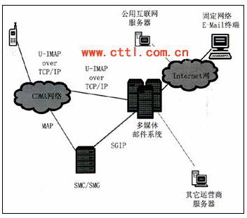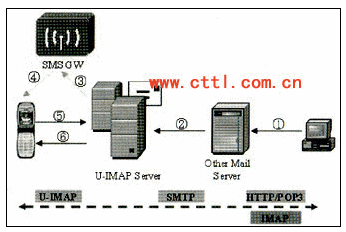 互聯(lián)網(wǎng)郵箱到聯(lián)通U-IMAP手機終端業(yè)務(wù)支持互聯(lián)網(wǎng)郵件用戶直接向手機終端用戶發(fā)送郵件,需要郵件服務(wù)器、U-IMAP Server以及移動手機終端的支持,根據(jù)實際情況,有時還需要短信中心的支持,用于向移動手機終端發(fā)送郵件到達的通知。郵件服務(wù)器與U-IMAP Server之間的協(xié)議采用SMTP協(xié)議,U-IMAP