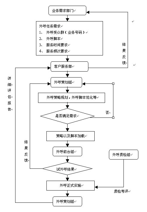 3、設(shè)立外呼策劃班組,負(fù)責(zé)與各業(yè)務(wù)需求部門接口,負(fù)責(zé)整個(gè)外呼策略的策劃,負(fù)責(zé)整個(gè)外呼計(jì)劃的實(shí)施,負(fù)責(zé)外呼腳本的編寫,負(fù)責(zé)外呼結(jié)果的評(píng)估等工作。