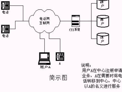 該業(yè)務(wù)方法涉及一種用戶電話轉(zhuǎn)移到CTI(Computer Telephony Integration)語音服務(wù)系統(tǒng)的接續(xù)服務(wù)方法,其CTI系統(tǒng)通過接口連接于公用電話網(wǎng),用戶在CTI系統(tǒng)登記,選擇服務(wù)功能,相關(guān)信息存入數(shù)據(jù)庫,用戶電話設(shè)置轉(zhuǎn)移;當(dāng)客戶呼叫已轉(zhuǎn)移用戶電話時,自動接入CTI語音系統(tǒng),請求相關(guān)信息,對信息進行分析判斷、處理,查詢數(shù)據(jù)庫用戶信息,以用戶名義進行接續(xù)服務(wù)。其完全避免了傳統(tǒng)CTI系統(tǒng)的專用特服號碼服務(wù)的弊端,充分利用了交換機的功能,以用戶的電話號碼為客戶提供語音、傳真、數(shù)據(jù)及人工接續(xù)服務(wù)。