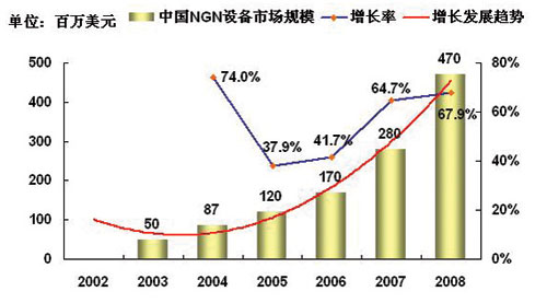 對(duì)于中國(guó)NGN市場(chǎng)規(guī)模的預(yù)測(cè),主要取決于各個(gè)運(yùn)營(yíng)商在NGN方面的戰(zhàn)略發(fā)展重點(diǎn),以及重點(diǎn)的投資方向?傮w上來(lái)說(shuō),從2003年起,以IPTV、VOIP、寬帶接入等業(yè)務(wù)為代表的NGN的部分業(yè)務(wù)的推廣,使得事實(shí)上中國(guó)已經(jīng)形成一定的NGN的市場(chǎng)規(guī)模,盡管這一市場(chǎng)規(guī)模仍然很小。2004年中國(guó)的NGN基礎(chǔ)設(shè)備的市場(chǎng)規(guī)模超過(guò)8千萬(wàn)美元,以后隨著各個(gè)運(yùn)營(yíng)商N(yùn)GN戰(zhàn)略的進(jìn)一步清晰,這一部分的投資會(huì)保持持續(xù)穩(wěn)定的增長(zhǎng),2005~2008年以后的NGN設(shè)備投資規(guī)模的平均增長(zhǎng)率可以達(dá)到50%。