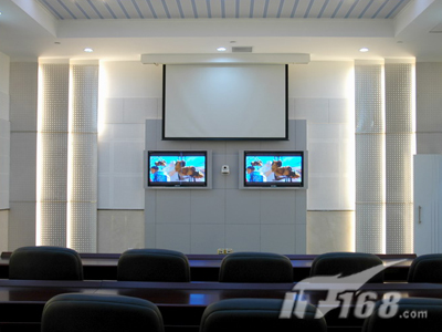 下面先看看主會(huì)場(chǎng)的效果,這會(huì)議的裝修設(shè)計(jì)比較大氣簡(jiǎn)約,中間是主席臺(tái),主顯示系統(tǒng)安裝的是BARCO(巴可)G5投影機(jī),兩側(cè)各設(shè)置一臺(tái)三星50寸等離子顯示器,可根據(jù)需要分別顯示相同或不同的圖像,大屏幕是DNP 120英寸光學(xué)背投屏幕,保證會(huì)議廳的每個(gè)人都能清楚地看到。