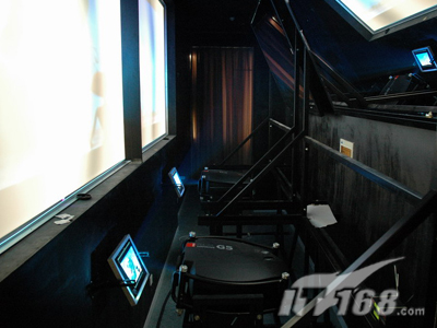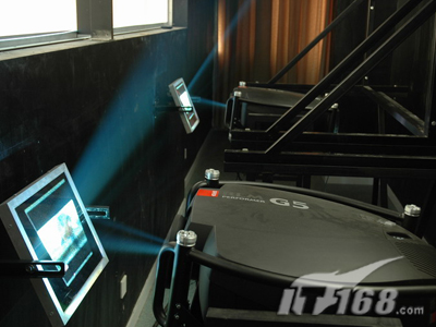 為了達(dá)到足夠大的尺寸,主屏幕采用SEAPRINE圖像控制器組成的1*2拼接,也就是采用了兩臺(tái)BARCO G5投影機(jī)來確保畫面的一流效果。不過由于投影距離的限制,這個(gè)方案里采用了二次反射系統(tǒng)。這也是這套方案的一個(gè)要點(diǎn)和關(guān)鍵。因?yàn)楹芏喙こ處熇靡恍└怕蕘砉浪阋淮位蚨啻握凵淇梢钥s短的投影距離,但欠缺科學(xué)和嚴(yán)謹(jǐn)?shù)膽B(tài)度,因?yàn)檫@個(gè)數(shù)據(jù)與屏幕安裝高度、投影方式(離軸或偏軸)、投影機(jī)體積、反射鏡面積等息息相關(guān)。
