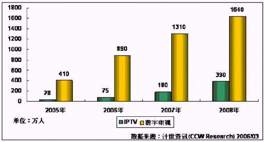 當(dāng)然,從國際上看,電信和廣電的融合是主流趨勢,但從目前國內(nèi)的情況來看,由于牽扯到利益沖突,融合并非一句話的事,仍需要克服重重阻力。計世資訊(CCW Research)的數(shù)據(jù)顯示,在2005年IPTV的用戶只有僅僅28萬人,而廣電數(shù)字電視用戶已經(jīng)達(dá)到410萬人。相信在未來幾年內(nèi)這個比例很難有大的變動。IPTV要想趕超數(shù)字電視還需要付出更大的努力。