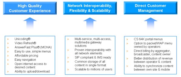 雖然視頻和多媒體服務(wù)的突然火熱對(duì)消費(fèi)者、企業(yè)和業(yè)界來(lái)說(shuō)都是件好事,但存在的挑戰(zhàn)還是很多,如怎樣提供高質(zhì)量的用戶體驗(yàn)、解決手機(jī)和網(wǎng)絡(luò)可互操作性問(wèn)題,以及集成商、廣播媒體和內(nèi)容提供商的直接用戶接觸與管理問(wèn)題。這些問(wèn)題的主要技術(shù)解決方案提供者有Unicoding®、Video Refresh®和AnswerFast Plus® (MONA的一部分),同時(shí)多媒體網(wǎng)關(guān)解決方案也包括在內(nèi)。其它方面的可互操作性和用戶體驗(yàn)改善問(wèn)題很容易能解決,對(duì)今天現(xiàn)有的WAP服務(wù)是一種補(bǔ)充。