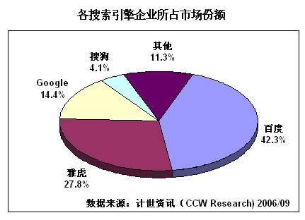 互聯(lián)網上的信息浩如煙海,是典型的信息爆炸,因此絕大多數(shù)網民都必須依靠搜索引擎才能找到所需信息,這個龐大的需求也就注定了搜索引擎市場的興旺繁榮。計世資訊(CCW Research)數(shù)據顯示:2004年中國的搜索引擎市場銷售總額達到9.4億元人民幣,增長67.9%,2005年繼續(xù)保持47.9%的增長速度,達到13.9億元,到2006年預計這個數(shù)字將突破20億元大關。