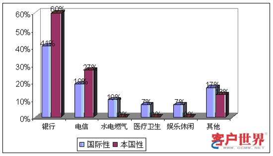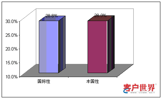 從業(yè)務功能看來,國際性呼叫中心和本國性呼叫中心承擔著不同的角色。9%的國際性呼叫中心和14%的本國性呼叫中心提供僅限于客戶服務,例如賬號查詢和催費收款。39%的國際性呼叫中心和59%的本國性呼叫中心專門展開網(wǎng)上營銷和銷售(外撥為主)。43%的國際性呼叫中心和29%的本國性呼叫中心同時承擔客戶服務和銷售功能。最后,我們調(diào)查到9%的國際性呼叫中心專門從事技術支持,而且這些中心專門為國際市場設立。服務功能上的差異會對商業(yè)定位和人力資源管理提出不同的要求。