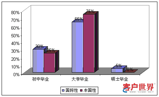 總的而言,參加調(diào)研的呼叫中心雇用的員工接受了平均15年的正式教育,也就是大學畢業(yè)的一般水平。國際性和本地型呼叫中心在勞動力的受教育水平上沒有呈現(xiàn)明顯差異。其中,30%的國際性和25%的本國性呼叫中心大量雇用初中畢業(yè)程度(12年教育)的員工;65%的國際性和75%的本國性呼叫中心雇用高中畢業(yè)程度(15年教育)的員工;此外,5%的國際性呼叫中心,往往是提供技術支持服務,主要雇用碩士畢業(yè)水平(17年教育)的員工。
