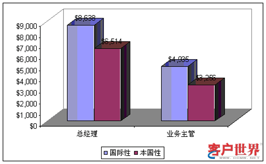 管理人員的薪酬水平明顯高于一線人員的薪酬水平。呼叫中心總經(jīng)理的年收入達到$8,194,其中在國際性呼叫中心為$8,638而在本地性呼叫中心為$6,514。對于業(yè)務主管來說,平均年工資為$4,253,其中在國際性呼叫中心$4,935而在本地性呼叫中心$3,256。