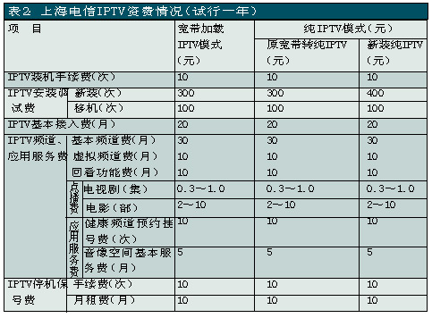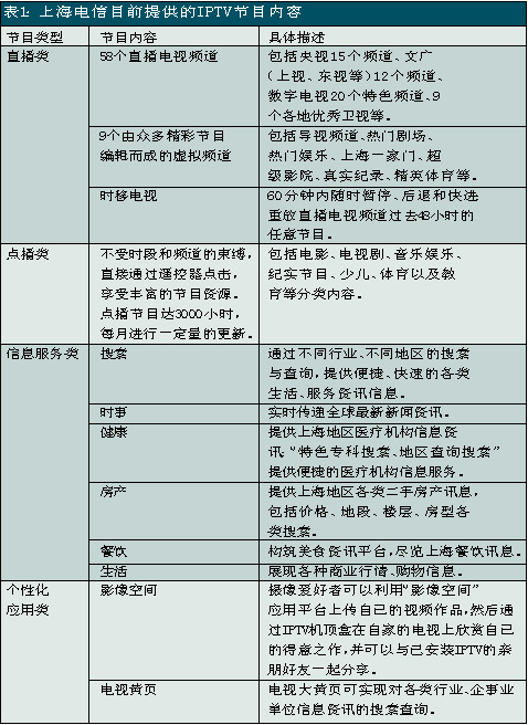 上海電信是國內(nèi)關(guān)注并切入IPTV業(yè)務(wù)較早的電信運營商之一,自2005年就開始積極測試和試驗。此次上海電信在全上海市范圍內(nèi)推出IPTV業(yè)務(wù),被業(yè)界看作是“中國IPTV規(guī)模商用的新紀元”。除了影視節(jié)目收看、視頻內(nèi)容點播、時移功能外,上海電信的IPTV服務(wù)還包括時事新聞、遠程醫(yī)療、視頻房產(chǎn)信息、餐飲信息、天氣預報、票務(wù)查詢等信息服務(wù)以及可視電話、IPTV游戲等個性化應用。其中IPTV的直播頻道有58個,視頻點播可選節(jié)目量達3000小時以上。另外,上海電信還推出了影像空間和電視大黃頁等應用服務(wù),攝像愛好者可以利用“影像空間”應用平臺上傳自己的視頻作品,然后通過IPTV機頂盒在自家的電視上欣賞自己的得意之作,并可以與已安裝IPTV的親朋好友一起分享;電視大黃頁可實現(xiàn)對各類行業(yè)、企事業(yè)單位信息資訊的搜索查詢。