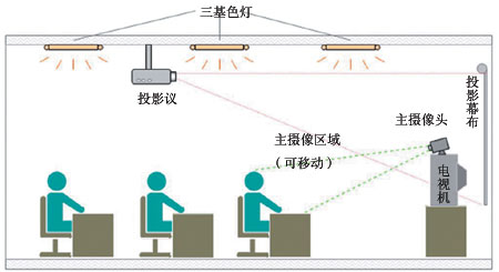 燈光照度是會議室的基本必要條件。攝像機(jī)均有自動彩色均衡電路,能夠提供真正自然的色彩,從窗戶射入的光(色溫約5800K)比日光燈(3500K)或三基色燈(3200K)偏高,如室內(nèi)有這兩種光源(自然光和人工光源),就會產(chǎn)生有藍(lán)色投射和紅色陰影區(qū)域的視頻圖像; 另一方面是召開會議的時(shí)間是隨機(jī)的,上午、下午的自然光源照度與色溫均不一樣。因此會議室應(yīng)避免采用自然光源,而采用人工光源,所有窗戶都應(yīng)用深色窗簾遮擋。在使用人工光源時(shí),應(yīng)選擇冷光源,諸如“三基色燈”(R、G、B)效果最佳(圖2)。避免使用熱光源,如高照度的碘鎢燈等。會議室的照度,對于攝像區(qū),諸如人的臉部應(yīng)為500LUX,為防止臉部光線不均勻(眼部鼻子和全面下陰影)三基色燈應(yīng)旋轉(zhuǎn)適當(dāng)?shù)奈恢,這在會議電視安裝時(shí)調(diào)試確定。對于監(jiān)視器及投影電視機(jī),它們周圍的照度不能高于80LUX,在50~80LUX之間,否則將影響觀看效果。為了確保文件、圖表的字跡清晰,對文件圖表區(qū)域的照度應(yīng)不大于700LUX。