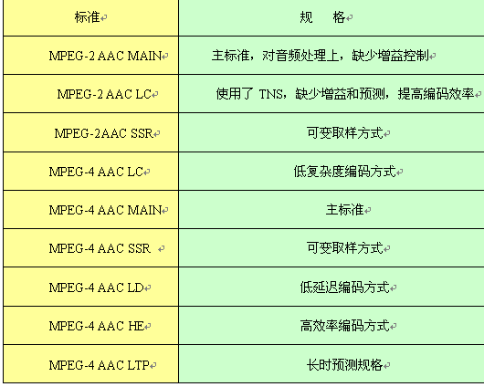 目前國際上對音頻處理技術(shù)上標(biāo)準(zhǔn)較多,在對下一代實時交互音頻處理上可以采用MPEG-1Layer2或AAC系列音頻,對選用標(biāo)準(zhǔn)的原則是,音頻頻響范圍要達(dá)到22KHz,這樣就幾乎可以覆蓋了人耳聽覺的全部范圍,甚至在高頻方面還有所超越,能夠使現(xiàn)場音頻得到真實自然的還原,并且在還原時可以采用雙聲道立體聲回放,使整個視頻通訊的聲音有更強的臨近感,達(dá)到CD級音質(zhì)。同時在對鏈路帶寬的適應(yīng)和編解碼效率上達(dá)到最佳。下表列出AAC的9種規(guī)格。