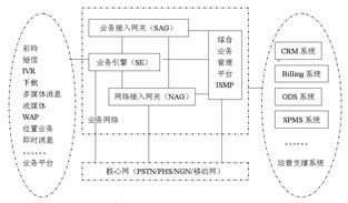 在電信集團(tuán)的統(tǒng)一規(guī)劃下,ISMP和SAG相繼推出。ISMP是綜合增值業(yè)務(wù)管理平臺(tái),ISMP不但可以解決現(xiàn)網(wǎng)固網(wǎng)/PHS業(yè)務(wù)管理的問(wèn)題,而且可以配合促進(jìn)3G業(yè)務(wù)試驗(yàn)和體驗(yàn),不斷完善,進(jìn)行增值業(yè)務(wù)價(jià)值鏈、業(yè)務(wù)內(nèi)容合作,收集市場(chǎng)需求和完善的增值業(yè)務(wù)應(yīng)用模式,整合和強(qiáng)化現(xiàn)有的市場(chǎng)營(yíng)銷環(huán)節(jié)。SAG是業(yè)務(wù)接入網(wǎng)關(guān),它包含與業(yè)務(wù)引擎的“業(yè)務(wù)能力驅(qū)動(dòng)”接口,包含與ISMP的“SP/用戶管理”接口,包含對(duì)移動(dòng)和固定網(wǎng)絡(luò)的支持。ISMP、SAG與業(yè)務(wù)平臺(tái)和周邊支撐系統(tǒng)的關(guān)系如圖7所示。