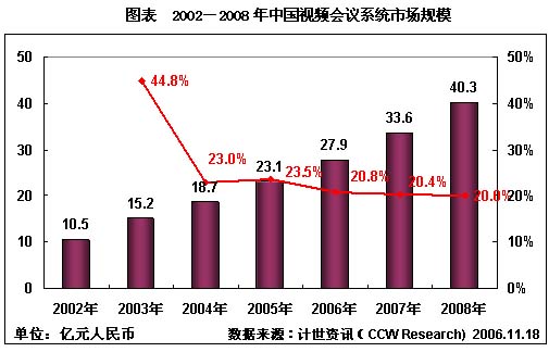 在2003年的井噴式發(fā)展之后,視頻會(huì)議系統(tǒng)市場(chǎng)發(fā)展速度開始進(jìn)入低速發(fā)展階段,市場(chǎng)逐漸出現(xiàn)飽和的趨勢(shì)。計(jì)世資訊(CCW Research)最新視頻會(huì)議報(bào)告數(shù)據(jù)顯示,從2003年非典時(shí)期視頻會(huì)議市場(chǎng)井噴式發(fā)展之后,2006年視頻會(huì)議系統(tǒng)的增長(zhǎng)率開始下降,如何開發(fā)新的產(chǎn)品,成為視頻會(huì)議系統(tǒng)市場(chǎng)繼續(xù)發(fā)展的關(guān)鍵。而3G商用的到來,由此產(chǎn)生的移動(dòng)視頻業(yè)務(wù)也必將成為未來移動(dòng)通信新的市場(chǎng)增長(zhǎng)點(diǎn),可以說,移動(dòng)信息化建設(shè)將為視頻會(huì)議系統(tǒng)開拓一片新的藍(lán)海。
