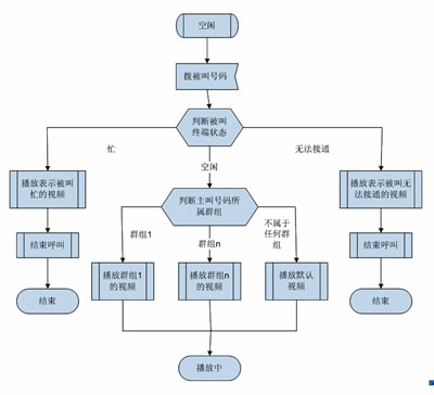 多媒體彩鈴用戶可以為某一位或某一組主叫用戶設(shè)定不同的視頻,當(dāng)某個(gè)主叫用戶來電時(shí),系統(tǒng)根據(jù)被叫用戶的狀態(tài)和主叫所屬的群組播放不同的視頻。如果被叫忙或者無法接通,則播放能表達(dá)被叫當(dāng)前狀態(tài)的默認(rèn)系統(tǒng)視頻;如果被叫空閑,則根據(jù)主叫號(hào)碼所屬的群組播放被叫為該群組定制的視頻。無論在哪種情況下,主叫都可以在手機(jī)上欣賞到精彩的視頻媒體。圖1是多媒體彩鈴業(yè)務(wù)使用流程。