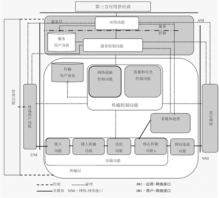 圖2展示了下一代網(wǎng)絡(luò)結(jié)構(gòu)。根據(jù)Y.2011建議書,下一代網(wǎng)絡(luò)的功能分為服務(wù)層和傳輸層。終端用戶功能由用戶-網(wǎng)絡(luò)接口(UNI)接到下一代網(wǎng)絡(luò),而其他網(wǎng)絡(luò)則通過網(wǎng)絡(luò)—網(wǎng)絡(luò)接口(NNI)互相連接。