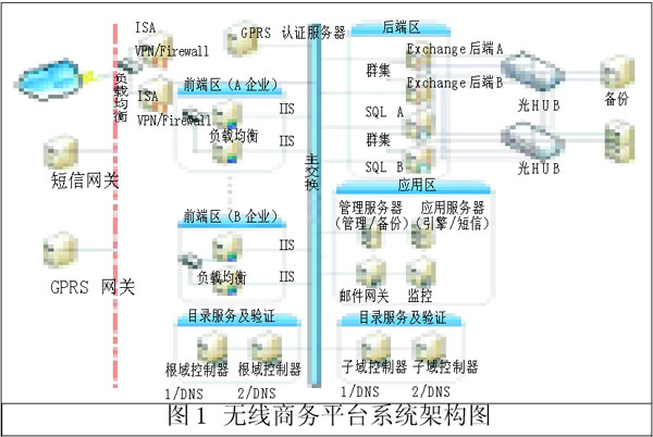無線商務(wù)平臺以微軟活動目錄服務(wù)和Exchange服務(wù)器為平臺搭建,操作系統(tǒng)可以采用MS Windows 2003 Server,企業(yè)郵箱采用MS Exchange 2003,數(shù)據(jù)庫采用MS SQL 2005,互聯(lián)網(wǎng)和VPN接入采用MS ISA 2004,監(jiān)控采用MOM 2005。