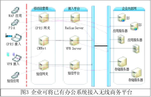 該平臺還支持多種用戶接入方式,允許通過多種不同的渠道和訪問設(shè)備,包括筆記本電腦、PDA和移動電話(手機(jī)),由GPRS或WLAN等多種網(wǎng)絡(luò)接入辦公系統(tǒng)。具體接入方式包括:   這里介紹的無線商務(wù)平臺適合沒有成型信息系統(tǒng)的企業(yè)接入,對于企業(yè)已經(jīng)建有辦公系統(tǒng)的情況,可以提供專線接入的無線商務(wù)解決方案(如圖3所示),企業(yè)通過專線接入無線商務(wù)平臺,這種情況需要對企業(yè)辦公系統(tǒng)進(jìn)行一定的改造來實(shí)現(xiàn)全部移動辦公功能。