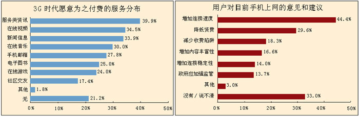 目前用戶對手機上網(wǎng)的意見主要集中在速度和資費方面,要求增加速度的比例超過了所有用戶的4成,降低資費和減少收費陷阱的比例分別為29.6%和18.3%。