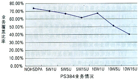 由圖1可知,當(dāng)HSDPA分配功率為5W時(shí),HSDPA對網(wǎng)絡(luò)覆蓋沒有很大影響;當(dāng)它為10W時(shí),如果HSDPA用戶數(shù)不大,影響也有限;但是,當(dāng)它為10W時(shí),如果HSDPA用戶數(shù)持續(xù)增加,則會(huì)產(chǎn)生嚴(yán)重影響。在下行從NOHSDPA的74%降低到10W15U的40.62%時(shí),PS384業(yè)務(wù)降低了近一半。同時(shí),隨著業(yè)務(wù)速率的提高,網(wǎng)絡(luò)影響越大。另外,在一定的HSDPA功率分配前提下,隨著HSDPA用戶數(shù)的增加,過載率增大,網(wǎng)絡(luò)中高速數(shù)據(jù)業(yè)務(wù)的比例隨之減少,各點(diǎn)上的用戶速率不斷降低;同時(shí),用戶的增多使得各小區(qū)的HSDPA發(fā)射功率不斷增大,導(dǎo)致區(qū)域中間各點(diǎn)的終端接收功率普遍增加。