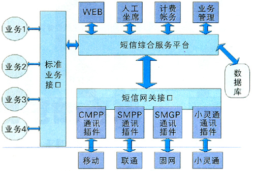業(yè)務(wù)管理平臺是為運(yùn)營商提供的可快速啟動(dòng)各種數(shù)據(jù)業(yè)務(wù)的平臺,具有強(qiáng)大的資源調(diào)度能力。它連接運(yùn)營商的基礎(chǔ)網(wǎng)絡(luò)和業(yè)務(wù)支撐系統(tǒng)(客服系統(tǒng)、計(jì)費(fèi)系統(tǒng)),為服務(wù)提供商/內(nèi)容提供商們提供各種移動(dòng)資源(如短信息中心資源、用戶信息資源、語音資源等)、功能資源(如單點(diǎn)認(rèn)證、計(jì)費(fèi)、漫游控制等)及各種公共的資源引擎(如地理位置、語音交互、推送信息等)。業(yè)務(wù)支撐系統(tǒng)是運(yùn)營商為了開展業(yè)務(wù)必須建設(shè)的客服系統(tǒng)、營業(yè)系統(tǒng)、計(jì)費(fèi)系統(tǒng)等子系統(tǒng)。圖3是目前常用的綜合短信平臺[3]。
