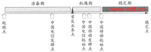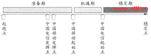 此版本是表示中國移動進入3G業(yè)務運營早于競爭對手。圖4根據(jù)中國移動和中國電信發(fā)放牌照的不同時期而將全業(yè)務運營市場策略劃分成準備期、機遇期和穩(wěn)定期。