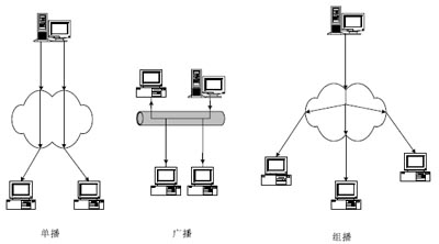 目前此類業(yè)務在IP網(wǎng)上幾乎都是采用IP組播的方式來實現(xiàn)的。IP網(wǎng)通信包括三種通信方式(如圖1所示):單播(Unicast)、廣播(Broadcast)和組播(Multicast)。單播是指源主機向指定單個目標主機發(fā)送數(shù)據(jù)信息,單播連接是一一對應的,即一個發(fā)送者只能對應一個接收者;廣播指源主機向一個網(wǎng)絡段中的所有主機發(fā)送數(shù)據(jù)信息,即該網(wǎng)段所有主機都可以接收這個數(shù)據(jù)信息;組播介于單播、廣播之間,源主機向網(wǎng)絡中特定的一組主機發(fā)送數(shù)據(jù)信息,這些主機是靠組播地址來指定的。