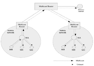 IETF的移動IP協(xié)議定義了家鄉(xiāng)代理(home Agent,簡稱HA)、外地鏈路、外地代理(foreign Agent,簡稱FA)、通信對端等概念,一個移動節(jié)點擁有兩個IP地址:家鄉(xiāng)地址和轉交地址。節(jié)點在移動過程中,家鄉(xiāng)地址不改變,發(fā)送到該節(jié)點的數(shù)據(jù)都通過家鄉(xiāng)地址與轉交地址之間的隧道轉發(fā)給移動節(jié)點。當組成員切換時,包括網(wǎng)絡鏈路間切換的固有時延,以及重新加入組播組以及建立組播轉發(fā)樹的時延,都將導致組播成員丟包。