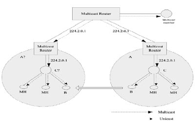 在極端的情況下,網(wǎng)絡A中組播組224.2.0.1只有C一個組播成員且網(wǎng)絡A中后來也無其他MH加入組播組224.2.0.1,C將通知上游路由器退出組播組224.2.0.1,這時候需要重新構建組播樹;而在網(wǎng)絡A′中,原來也沒有組播組224.2.0.1的組成員,當B要求加入組播組224.2.0.1時,網(wǎng)絡A′中的組播代理C′需要向上游網(wǎng)絡路由器發(fā)送加入組播組224.2.0.1的請求,然后向B轉發(fā)該組的組播數(shù)據(jù)包,這時的切換有可能因為切換時延而導致組播數(shù)據(jù)包丟失。