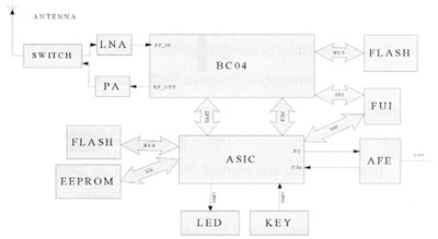 其中,BC04支持最大4個活動連接(包括耳機(jī)),同時支持兩路SCO語音,所以語音通過PCM和ASIC PCM相接可以有多路被送到模擬端,從而實(shí)現(xiàn)3方通話。ASIC部分實(shí)現(xiàn)PCM語音數(shù)據(jù)與模擬語音信號的相互轉(zhuǎn)換,通過發(fā)送和接收PSTN信令,負(fù)責(zé)對人機(jī)界面的控制。它通過GPIO(General