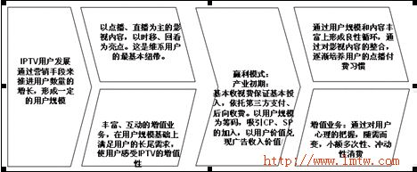 IPTV產(chǎn)業(yè)的發(fā)展,前期是通過其中的特殊功能來吸引用戶,如時移等,但之后,真正能吸引用戶的其中的某項業(yè)務(wù)。這在IPTV的宣傳策略上需要重視。