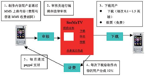 M1新加坡移動(dòng)運(yùn)營(yíng)商M1推出了用戶制作及共享視頻業(yè)務(wù)——MeTV,用戶可以通過(guò)MMS上傳視頻內(nèi)容,其它用戶可以瀏覽并下載。這項(xiàng)業(yè)務(wù)為用戶提供了一個(gè)展示自己和了解他人的平臺(tái)。這個(gè)業(yè)務(wù)也建立了與用戶分成的模式,用戶可以從自己上傳的內(nèi)容中獲得利潤(rùn)。用戶上傳的視頻內(nèi)容,被他人下載一次,用戶就可以獲得0.05新元。自從2007年3月該業(yè)務(wù)推出以來(lái),已經(jīng)有超過(guò)4萬(wàn)名用戶,收入最高的用戶已經(jīng)達(dá)到50~100新元。