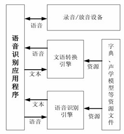 上圖示為Wanson ASR Chip1.0 的系統(tǒng)框圖。如圖所示,由系統(tǒng)所構(gòu)筑的語(yǔ)音識(shí) 別應(yīng)用程序和四部分相結(jié)合。對(duì)語(yǔ)音識(shí)別而言,將接收到的語(yǔ)音文件包通過錄音 接口傳給語(yǔ)音識(shí)別引擎。該引擎在執(zhí)行語(yǔ)音識(shí)別任務(wù)時(shí),根據(jù)系統(tǒng)指令從資源文 件中調(diào)用所需要的語(yǔ)言模型,聲學(xué)模型,字典等資源。當(dāng)語(yǔ)音識(shí)別任務(wù)完成后, 系統(tǒng)將識(shí)別出來的結(jié)果放在系統(tǒng)隊(duì)列中,供下級(jí)設(shè)備讀取。