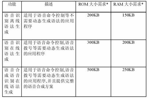 對(duì)于嵌入式的語(yǔ)音識(shí)別系統(tǒng),RAM 和ROM 的大小需求是由應(yīng)用系統(tǒng)的功能設(shè) 計(jì)所決定的。同時(shí),不同的RAM 和ROM 大小又影響著識(shí)別的準(zhǔn)確率和響應(yīng)速 度。一般情況下,較大的RAM 和ROM 存儲(chǔ)空間和快速的RAM和ROM 速度更 有利于識(shí)別速度和識(shí)別準(zhǔn)確率的提高。更多的情況下,在實(shí)際應(yīng)用中,考慮到性 能價(jià)格比,一般會(huì)選擇適當(dāng)?shù)腞AM 和ROM 尺寸以達(dá)到速度和識(shí)別率的平衡。 如下表所示: