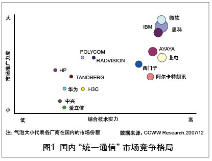 “統(tǒng)一通信”與傳統(tǒng)通信的根本區(qū)別在于不僅僅是網(wǎng)絡(luò)的融合,也是應(yīng)用的融合。從這個層面來看,“統(tǒng)一通信”真正帶給用戶的是成本的降低、工作效率的提升以及整個運(yùn)行機(jī)制的改變。“統(tǒng)一通信”是以人性化為特征應(yīng)用層面的融合,這種融合囊括了更多的內(nèi)容、覆蓋更廣闊的領(lǐng)域、具有更大的力量,它使得通信產(chǎn)業(yè)與IT產(chǎn)業(yè),通信設(shè)備商、軟件廠商與電信運(yùn)營商之間的邊界越來越模糊,跨行業(yè)、跨領(lǐng)域的聯(lián)盟與合作成為開拓市場的必需。但隨著眾廠商的紛紛加入,多款“統(tǒng)一通信”產(chǎn)品及解決方案的推出,“統(tǒng)一通信”市場展現(xiàn)出了勃勃生機(jī)和巨大的成長潛力。在這些廠商中,有市場調(diào)研數(shù)據(jù)顯示思科市場份額領(lǐng)先,市場占有率高達(dá)35%。各類廠商之間既有競爭又有合作,但還沒有一個廠商占絕對優(yōu)勢。實(shí)際上,“統(tǒng)一通信”市場上的競爭者并不僅僅是這幾家巨頭,眾多網(wǎng)絡(luò)工具廠商、商用電話廠商也參與了這一競爭平臺。幾乎所有和ICT有關(guān)的巨頭廠商都集中在了這個領(lǐng)域,“統(tǒng)一通信”正進(jìn)入群雄爭霸的時代。國內(nèi)“統(tǒng)一通信”市場競爭格局如圖1所示。