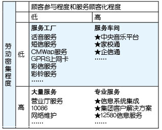 表1中以“★”標(biāo)識的服務(wù)基本上都是電信運(yùn)營企業(yè)開展移動信息化后向客戶提供的服務(wù),可以明顯看出,更高的顧客參與度、更多的顧客化是這些服務(wù)的共同特點(diǎn),所以,移動信息化運(yùn)營的就是由服務(wù)工廠向服務(wù)車間轉(zhuǎn)型、由大量服務(wù)向?qū)I(yè)服務(wù)轉(zhuǎn)型。