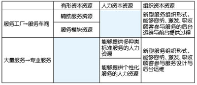 本質(zhì)上講,電信服務(wù)產(chǎn)品的四類服務(wù)都是在此二維機(jī)理的作用下生成的,服務(wù)的內(nèi)容映射著企業(yè)的有形資本資源和人力資本資源,服務(wù)的過程映射著企業(yè)的組織資本資源,從一種服務(wù)向另一種服務(wù)躍遷,不僅僅是服務(wù)過程和服務(wù)內(nèi)容的重新整合,更重要的是需要彌補(bǔ)相應(yīng)的資源,才能達(dá)到服務(wù)生成的結(jié)果,否則,躍遷就不會成功。
