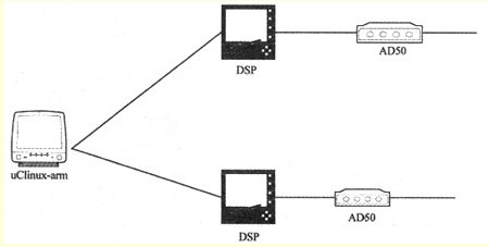 下一代媒體網(wǎng)關(guān)系統(tǒng)主要由媒體網(wǎng)關(guān)、媒體網(wǎng)關(guān)控制器和信令網(wǎng)關(guān)組成,實(shí)現(xiàn)了功能上的分解。為了適應(yīng)不同的網(wǎng)絡(luò),本文主要介紹了媒體網(wǎng)關(guān)的實(shí)現(xiàn)方法,其中媒體網(wǎng)關(guān)的主要作用是實(shí)現(xiàn)模擬信號由電路交換轉(zhuǎn)換成數(shù)字信號PCM編碼,并進(jìn)行G.711或者G.723等格式編碼。為了實(shí)現(xiàn)媒體網(wǎng)關(guān),整個(gè)系統(tǒng)由3部分組成,包括基于ARM架構(gòu)的嵌入式系統(tǒng)(uClinux)、語音信號轉(zhuǎn)換芯片(TLC320AD50)和定點(diǎn)數(shù)字信號處理器(TMS320VC54xx),如圖3所示。