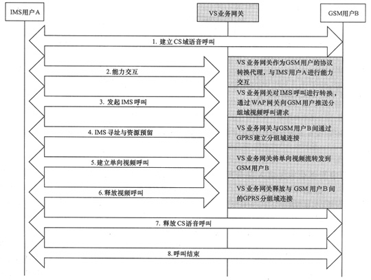 由于GSM網(wǎng)絡(luò)不可能立刻被替換掉,因此在一段時期內(nèi)會出現(xiàn)3G IMS網(wǎng)絡(luò)和GSM網(wǎng)絡(luò)共存的局面。VS作為IMS中的典型業(yè)務(wù)將隨著IMS網(wǎng)絡(luò)的部署得到大力推廣,此時會出現(xiàn)基于SIP協(xié)議的IMS終端用戶和GSM用戶終端進行VS業(yè)務(wù)互通的需求,下文將對這種業(yè)務(wù)需求的實現(xiàn)方案進行詳細介紹。
