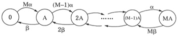 3. 視頻流媒體業(yè)務一直是我們關注的難點,為簡化分析,本文將視頻流媒體業(yè)務僅局限于視頻會議和視頻電話業(yè)務。我們可以把視頻流媒體業(yè)務看成是離散狀態(tài)的連續(xù)時間的Markovchain,則可以把視頻流媒體業(yè)務量化成有限的離散狀態(tài)(0,A,…,MA),狀態(tài)的轉移速率用α和β表示,α=3.9-β和β=3.9/(1+5.04458N/M)。如圖1所示。