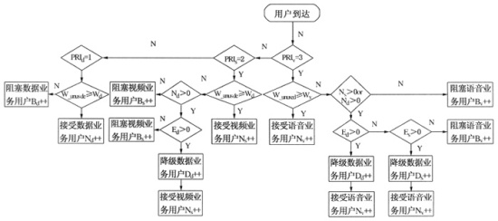 1)用戶到達事件。當帶寬資源充裕時,各類用戶到達不論優(yōu)先級高低,均可按需分配得到帶寬。當帶寬資源不能滿足接入需求帶寬時,則按照優(yōu)先級順序從低到高對已接入的用戶進行QoS降級服務(降一級或若干級),直到能夠騰出足夠的帶寬滿足新用戶的需求,否則阻塞該用戶,具體流程如圖2所示。